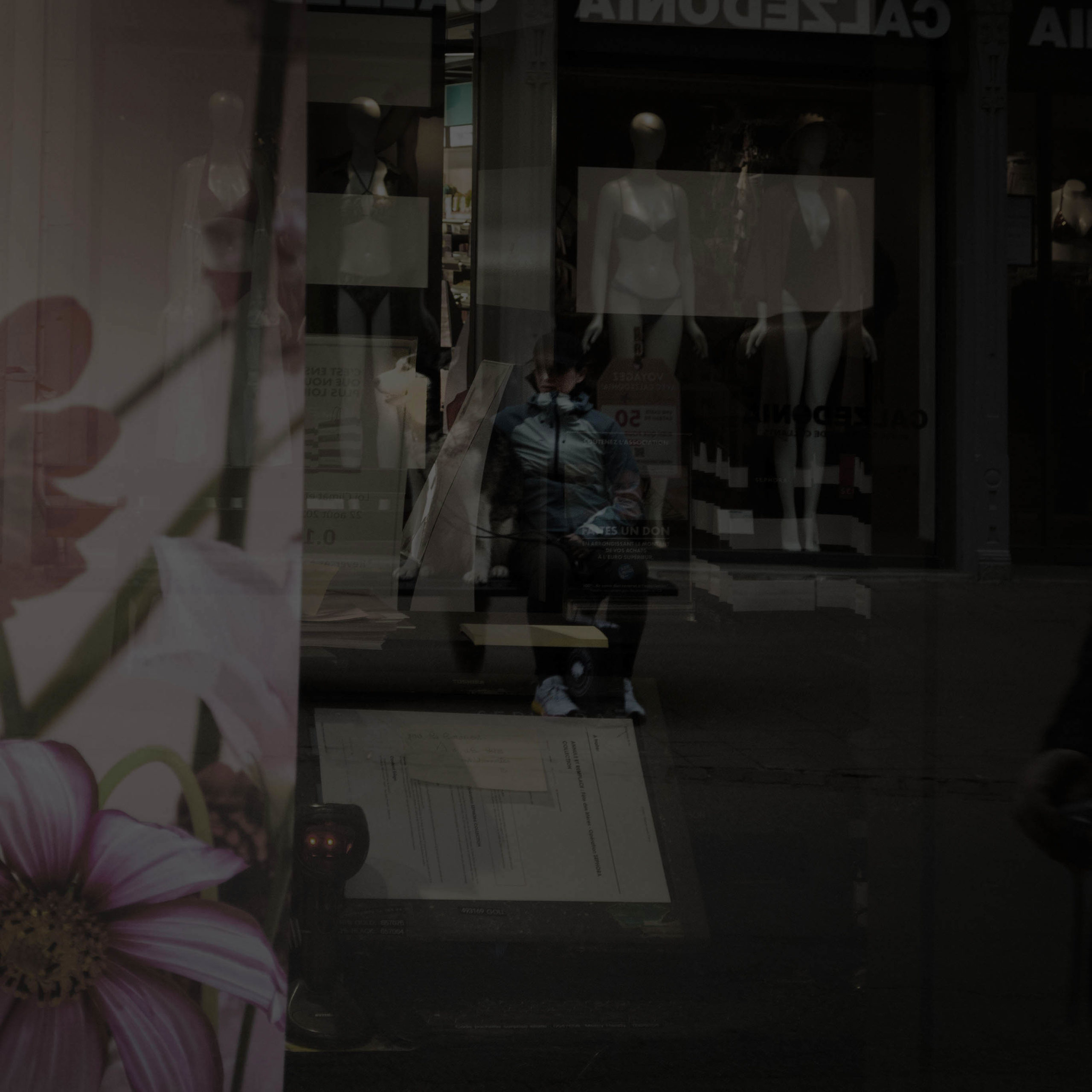 À certaines heures du jour ou de la nuit, on ne sait pas quand exactement, les vitrines se vengent de leur transparence. Le verre se maquille d’opacités si bien qu’aux éclairages maîtrisés des devantures se mêlent les éclaircies sauvages de la rue. Le dehors et le dedans s’embrouillent dans une lumière sans saison. Toutes ces choses exhibées, immobiles et propres derrière leurs barrières limpides, jetées aux yeux pour mieux les protéger des mains, viennent se diluer dans des lueurs parasites, dans d’étranges éclats taciturnes d’ombres incertaines, dans les reflets vagues et mouvants des passants anonymes qui, de l’autre côté des étalages et dans les contrejours des allées, battent le pavé .